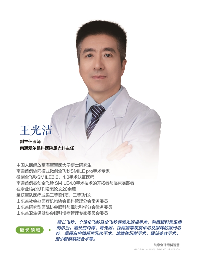 针对该技术的特点与适用人群,本次手术的主刀医生——主任医师王光洁博士(中国人民解放军海军军医大学博士研究生南通首例微创全飞秒 SMILE4.0手术的技术开拓者与临床实践者)进行了专业解读:“全飞秒SMILE技术本身已以‘无瓣、微创、恢复快’著称。而全飞PRO是在此基础上,结合大量临床反馈进行的‘体验优化版’。它通过技术升级,进一步实现了‘更快、更准、更舒适’,特别适合像郑先生这样眼部条件良好、追求高品质视觉且对手术安全性与舒适度有更高要求的年轻患者。这不仅是设备的升级,更是整体治疗理念向‘精准化、人性化’的深化。”